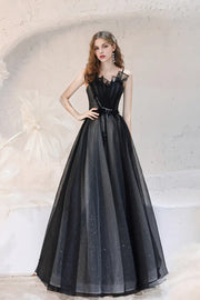 Lovely A-Line Spaghetti Straps Pleated Applique Tulle Black Long Prom Dress blends edgy elegance and delicate artistry. The A-line silhouette offers a graceful, flowing fit, anchored by subtle spaghetti straps. A pleated bodice creates texture and depth, while the black tulle skirt dusted with shimmering specksadds, a touch of celestial allure. Ruffled details at the neckline and a decorative waistband enhance the gown’s romance, balancing structure and softness.