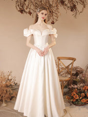 Low Cost A-Line Off Shoulder Pleated Satin White Floor Length Formal Prom Dress