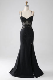 Mermaid Black V Neck Spaghetti Straps Hollow Beaded Long Evening Dress Prom Dress with Slit