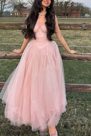 Pink Spaghetti Straps Empire-Waist Tulle Long Prom Party Dress