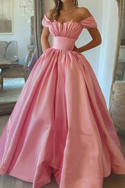 Pink Ball Gown Satin Off The Shoulder Retract Your Waist Long Prom Dress