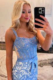 Classy Blue Lace Spaghetti Straps Straps With Bow Long Prom Dresses