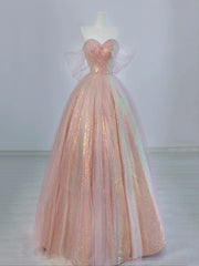 Pink Tulle And Sparkling Sequins Sweetheart Collar Floor Length Prom Dress Beautiful A-Line Evening Party Dress