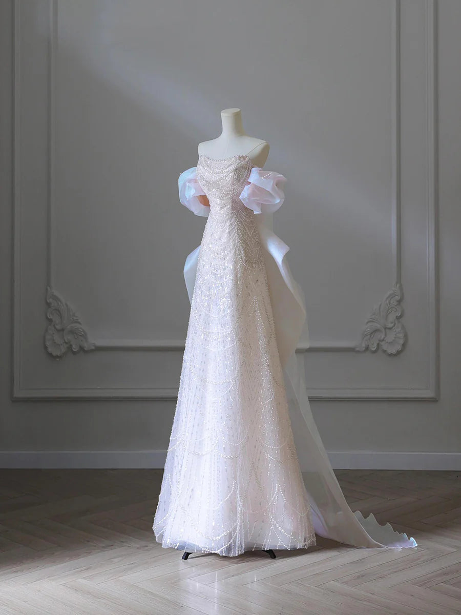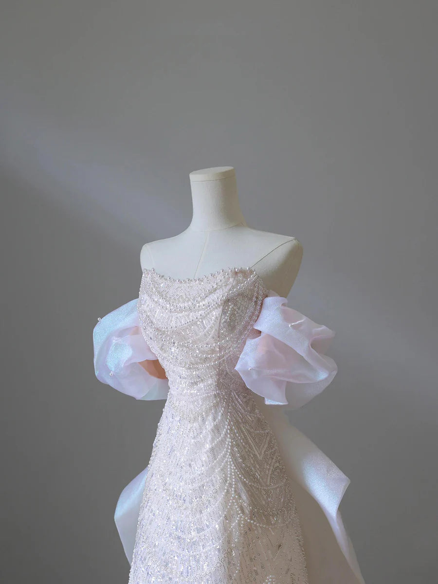 Pink Tulle Sequins Pearls Strapless A-Line Floor Length Long Prom Dress Party Dress