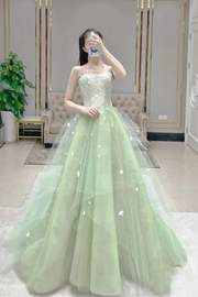 Pretty A-Line Strapless Bodycon Applique Floral Lace Tulle Green Long Prom Dress