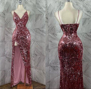 This elegant prom dress features a flattering mermaid silhouette with a deep V-neck and delicate spaghetti straps. Adorned with sparkling pink sequins, it offers a radiant rose hue that catches the light beautifully. The high slit adds a touch of daring sophistication while ensuring ease of movement. Crafted for memorable occasions, this long party dress seamlessly combines glamour with comfort. Ideal for women seeking a standout look without compromising on style or fit.