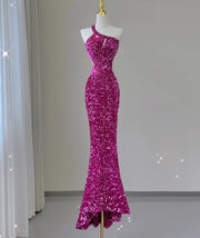 This elegant mermaid gown features a one-shoulder design adorned with shimmering sequins, creating a striking silhouette for formal occasions. The sleeveless cut and keyhole hollowing add subtle allure, while the long length enhances its sophisticated evening appeal. Perfect for prom or upscale events, this dress combines modern style with timeless glamour.
