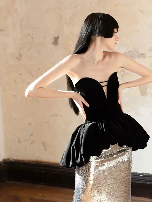 This stunning silver sequin mermaid dress features a sweetheart neckline and a strapless, sleeveless design, perfect for making a glamorous entrance. Its long silhouette highlights the figure elegantly, combining sparkle with sophistication for prom or special occasions. Crafted to enhance confidence and style, this dress is a standout choice for memorable nights and festive celebrations.