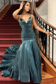 Spaghetti Straps V-Neck Pleats Sleeveless Mermaid Prom Dress
