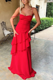 Red Tulle Spaghetti Straps Ruffles Sleeveless Lace-Up Long Prom Dress