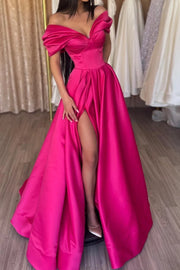 Sexy A-Line Off the Shoulder Pleated Satin Hot Pink Long Prom Dress With High Slit