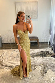 Ignite the night in this Sexy Mermaid V-Neck Slit Sequins Long Prom Dress With Short Train. It features a daringly deep V-neckline that accentuates your curves, paired with delicate spaghetti straps for a hint of elegance. The body-hugging mermaid silhouette, fully covered in shimmering gold sequins, ensures every move catches the light. A thigh-high slit adds a flirty, alluring touch, while the short train lends a touch of drama.