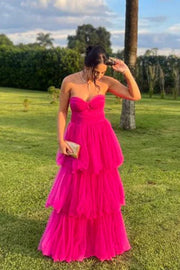 Sexy Pink Tulle A line Sweetheart Tiered Long Prom Dresses Budget Pink Party Dresses Birthday Outfits