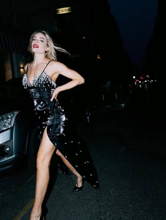 Sexy Sheath V Neck Pearl Black Satin Long Prom Dress Evening Dress with Slit - US 2 / UK 6 / EU 32