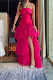 Sheath Elegant Pink Tulle Tiered Strapless Sleeveless Long Prom Dresses Discount Long Party Dress