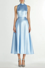 Simple and elegant Full of charm A Line Blue Halter Neck Satin Long Formal Dress