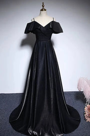 Simple Black Satin A-Line Off the Shoulder Floor Length Prom Dress Party Dress