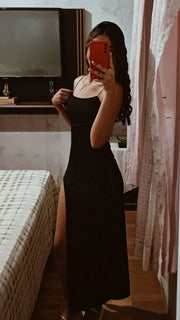 This elegant black satin dress features delicate spaghetti straps and a flattering slit, combining sophistication with a subtle allure. Its tea-length design offers a graceful silhouette perfect for formal occasions, proms, or evening parties. The smooth satin fabric ensures a comfortable fit while elevating your style effortlessly.