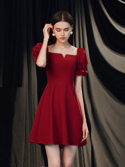 Simple Burgundy Satin Short Prom Dress, Retract Your Waist Cocktail Dress
