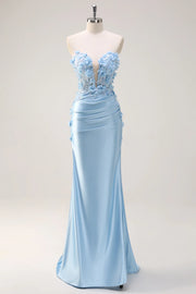 Sky Blue Deep V Neck Mermaid Strapless Sequin Floor Length Prom Dress With Appliques