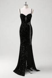 Sparkly Black Mermaid Fringed Long Slim-fit Prom Dress With Slit