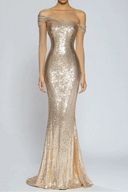 Sparkly Champagne Mermaid Off The Shoulder Sequins Long Formal Dress - US 2 / UK 6 / EU 32