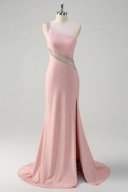 Sparkly Light Pink Mermaid One Shoulder Beaded Satin Long Prom Dress With Slit
