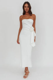 Step into elegance with this Strapless Sleeveless Ruffle Rosette White Midi Homecoming Dress With Slit Back. It features a chic strapless design that beautifully showcases the shoulders and collarbone, paired with a sleeveless cut for a refined look. A delicate ruffle rosette adorns the waist, adding a touch of romance and artistry, while the slit at the back brings a hint of allure and ease of movement. The midi length strikes a perfect balance between sophistication and playfulness.