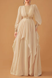 Unique design Champagne Ruffles A Line Long Prom Dress With Long Sleeves