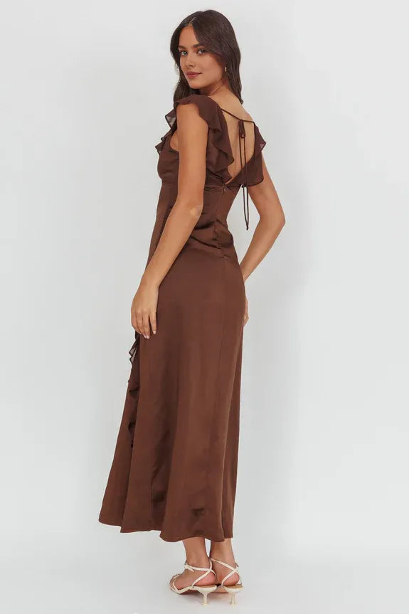 Elevate your style with this V Neck Sleeveless Ruffle Trimmed Chocolate Maxi Homecoming Dress. It showcases a flattering V-neckline that accentuates the neck and collarbone, paired with sleeveless design for a breezy feel. Delicate ruffle trims adorn the neckline and skirt, adding a touch of romance and movement. The chocolate-hued fabric offers a rich, sophisticated look, while the maxi length creates an elegant silhouette.