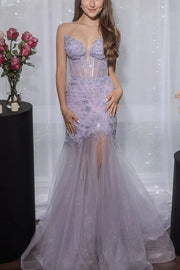 Lilac Strapless V-Neck Lace Appliques Mermaid Long Prom Dress with Slit