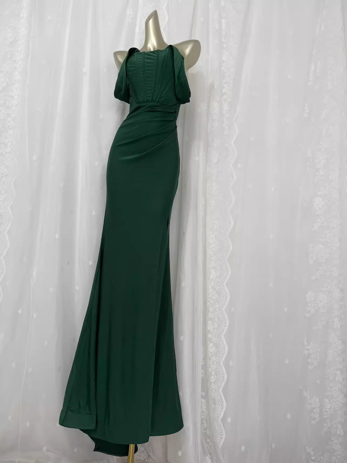 Vintage Mermaid Green Vacation Dress Satin Off The Shoulder Prom Dresses