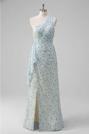 White Blue One Shoulder Flower Ruffled Long Prom Dress With Slit