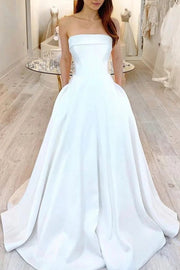 White Satin Strapless Long Prom Dresses A-Line Floor Length Formal Evening Dresses