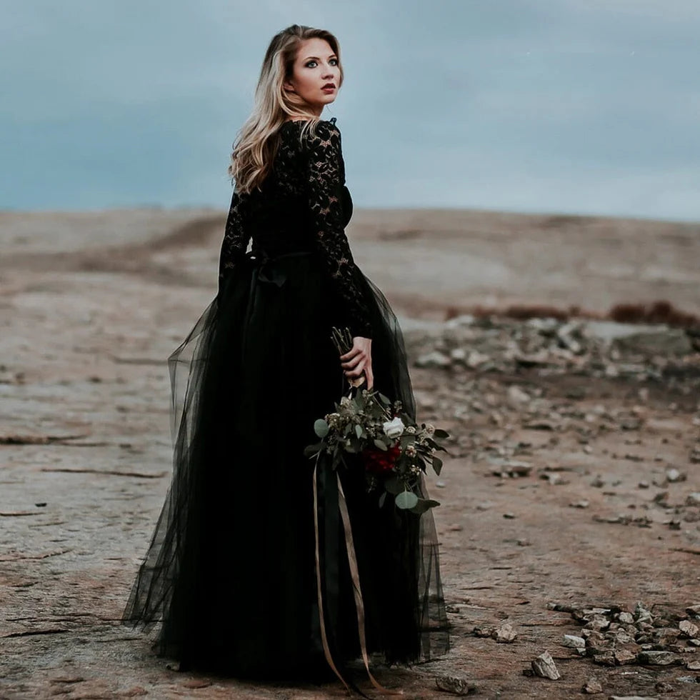 A-Line Black Floral Lace Appliqued Scoop Neck Long SleevesFloor Length Wedding Dress With Train