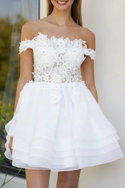 A-Line White Lace Organza With Applique Beaded Off the Shoulder Tiered Short Prom Dress Wedding Dresses