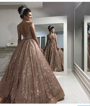 Champagne sequin long prom dress Sleeveless ball gown V-Neck evening dress