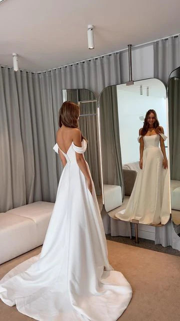 Classic fit Satin A Line Sleeveless Off The Shoulder Silt Long Train Wedding Dresses