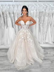 Elegant Champagne Tulle Lace Strapless Long Prom Dress Formal Dress Wedding Dress