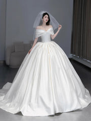 Elegant Ivory Satin Pleated Off Shoulder A-Line Long Formal Dress Wedding Dress