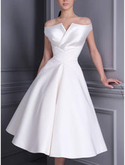 Little White Sleeve Tea Length Satin Dress Bridal Shower Dresses Wedding Dresses A-Line Off Shoulder Cap Bridal Gowns With Pleats Solid Color