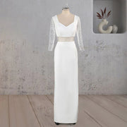 This elegant sheath wedding dress combines refined satin and delicate lace adorned with subtle sequins for a sophisticated shimmer. Its V-neckline and tasteful cutouts enhance the neckline, while long sleeves provide graceful coverage. The full-length design creates a sleek silhouette, perfect for a timeless bridal look.