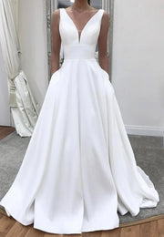 Simplicity White Satin V Neck A-Line Long Prom Dress Evening Dress