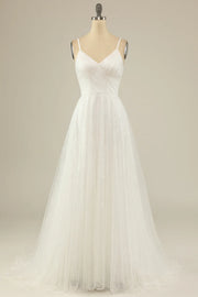 White Tulle V Neck Spaghetti Straps Back Zipper A Line Floor Length Party Dress